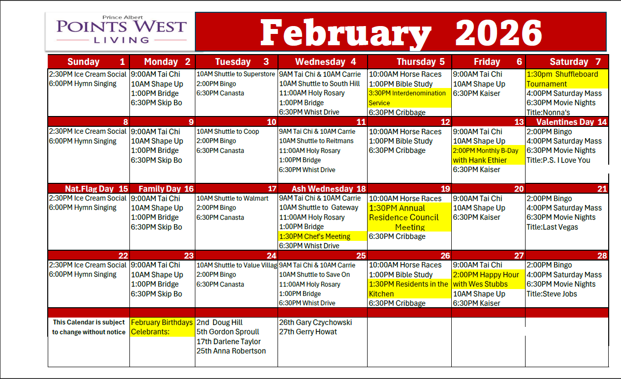 PWL Prince Albert offers a "big city" residence with everything you need to live an active independent lifestyle. Each well appointed suite includes its own washer and dryer for your convenience. Leave the daily chores to us, while you enjoy a variety of on-site programs and amenities. Play billiards, shuffleboard, enjoy some relaxing time watching television or a good game of cards in the games room.